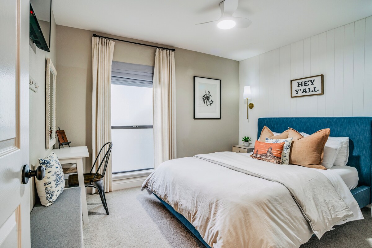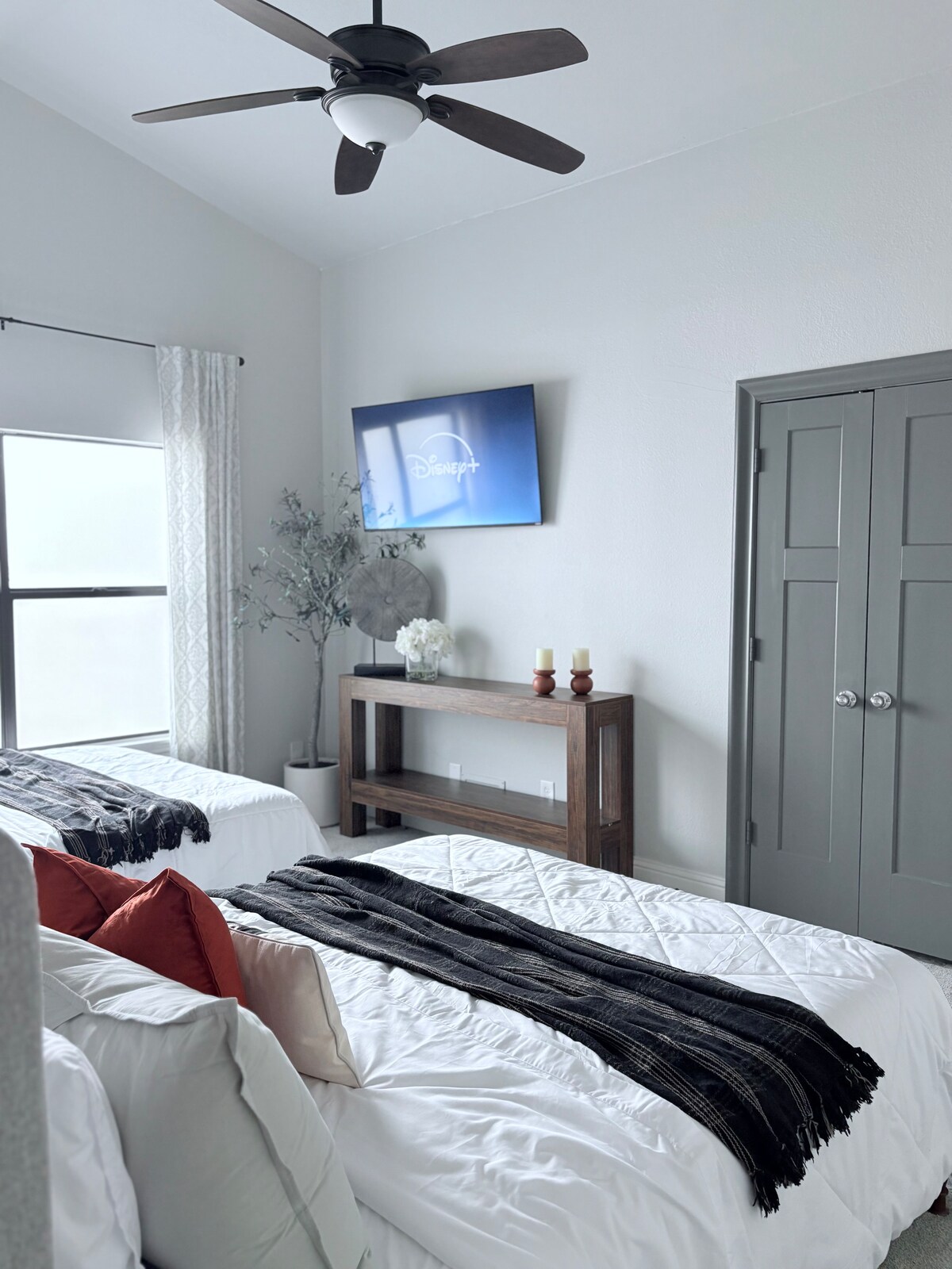 Spacious and stylish, features one queen bed, a 32” Smart TV, a ceiling fan, and a desk with chair to do your make up or use as a work station.