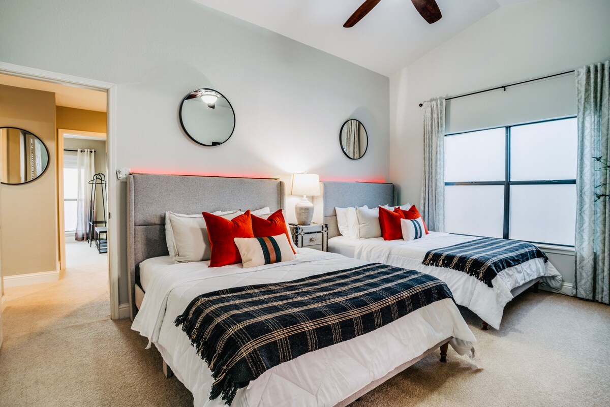 Featuring two queen beds, a large walk-in closet with a safe closet, an en suite bathroom, a 55” Smart TV, and a light-up makeup vanity.